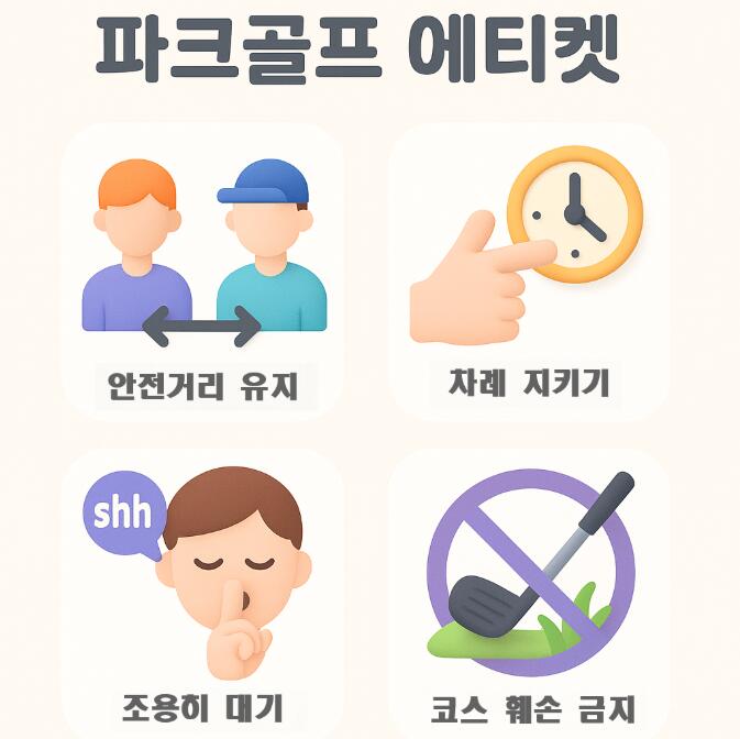 특히 파크골프는 좁은 공간에 많은 인원이 밀집하는 경우가 많으므로 안전 사고 예방과 타인에 대한 배려가 필수적입니다.